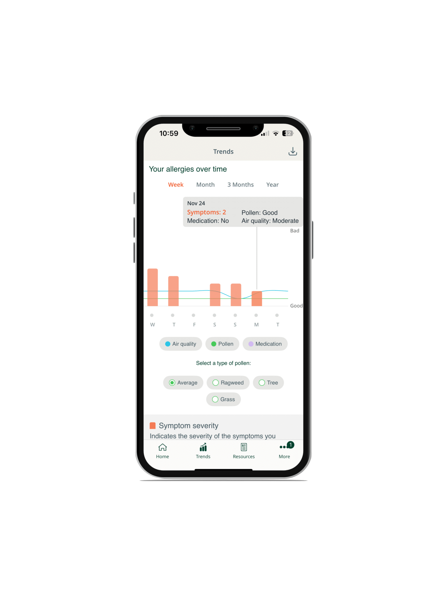 Allergy Buddy, developed by Aptar Digital Health is an everyday companion app for people managing allergic rhinitis and seasonal allergies. It blends local environmental intelligence on pollen, air quality, and weather with simple symptoms and medication tracking to deliver clear, trustworthy insights each day.